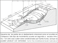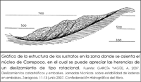 El nombre de Correpoco, curiosamente, nos da la primera pista de que se trata de un pueblo en movimiento. Este núcleo se asienta sobre una ladera de fuerte pendiente, que ha sufrido varios deslizamientos de tipo rotacional (Gráfico de la derecha).