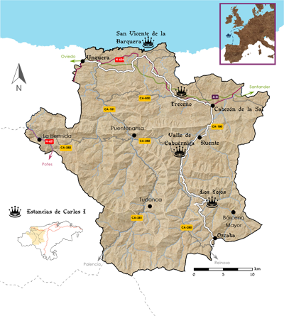 La primera vez que Carlos I pisó la península Ibérica tenía 17 años y venía desde Flandes para ser coronado rey en Valladolid, sede de la corte castellana. Las primeras etapas de aquel viaje que discurren por tierra firme, atraviesan el territorio de nuestra mancomunidad, pues tomaron el antiguo camino a Castilla por la cuenca del río Saja. Hicieron noche en San Vicente de la Barquera, Treceño, Valle de Cabuérniga y Los Tojos.