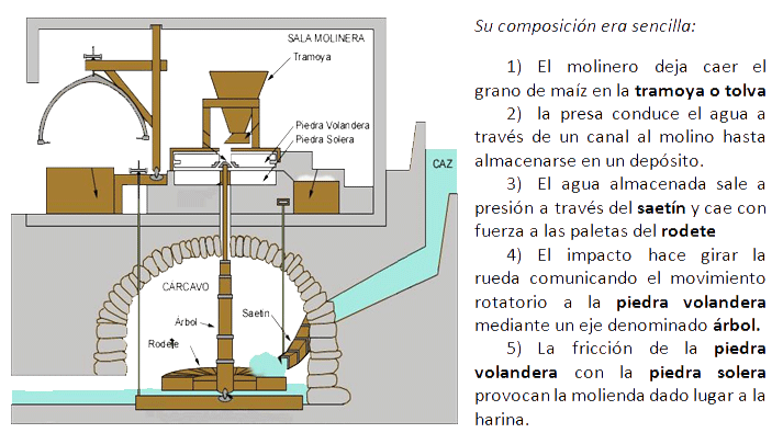 Por lo general, el molino era un edificio que se ubicaba en las cercanías del pueblo, junto a una corriente fluvial que le servía como energía potencial de agua, convirtiéndola en cinética. Estos molinos harineros se construían en el mismo cauce de un río, de modo que la fuerza de la corriente movía directamente una rueda hidráulica vertical de paletas, que a través de un sistema de engranajes y de embragues, transmitían el movimiento de giro del eje horizontal de la rueda al eje vertical de una piedra de moler.