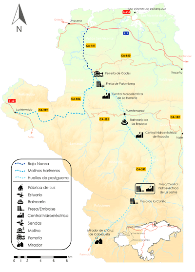 La fuerza motriz del río Nansa, ha dado lugar a un gran patrimonio industrial con ferrerías, presas y mini-centrales hidroeléctricas. Será la empresa Saltos del Nansa, fundada tras la Guerra Civil en 1941, quien más aproveche el potencial del río y más intervenga su cauce.