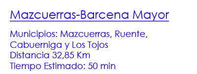 Este itinerario comienza junto al bello núcleo de Mazcuerras, y circula por las carretera CA-180 y CA-280, para posteriormente desviarse por la CA-817 y culminar esta ruta en Bárcena Mayor. Esta ruta esta ideada para poder disfrutar del territorio sobre el que escribieron José María de Pereda y Manuel Llano, entre otros.