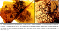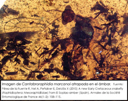 El ámbar es el resultado de la fosilización de la resina que exudaban los árboles, muy pegajosa y donde quedaban adheridos diversos tipos de organismos como insectos, polen, incluso burbujas de aire o gotas de agua de hace 110 millones de años.