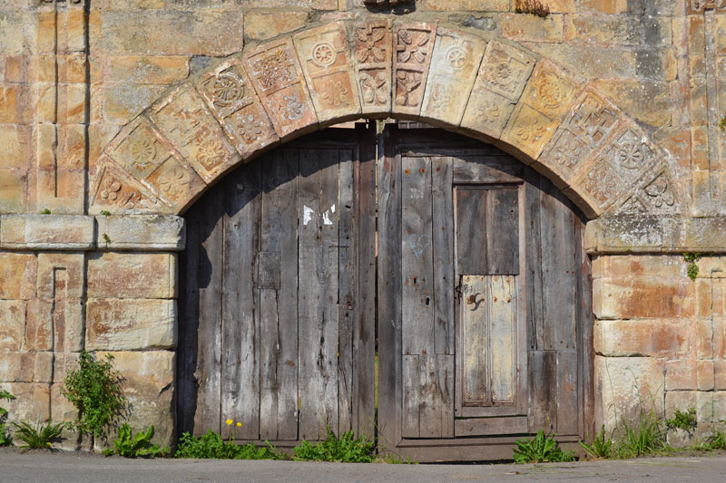 El acceso a la finca y al palacio es a través de una espectacular portalada de piedra de sillería que se divide en dos cuerpos y en la que destaca tanto el arco rebajado de acceso cuyas dovelas tienen labrados motivos vegetales como las pilastras rehundidas o las columnas estriadas que dan muestra del recargo típico del barroco. Pero, sin duda alguna, el elemento más singular de esta portalada debió de ser el escudo timbrado con un yelmo, hoy poco visible, que se sitúa en el frontis del cuerpo superior.